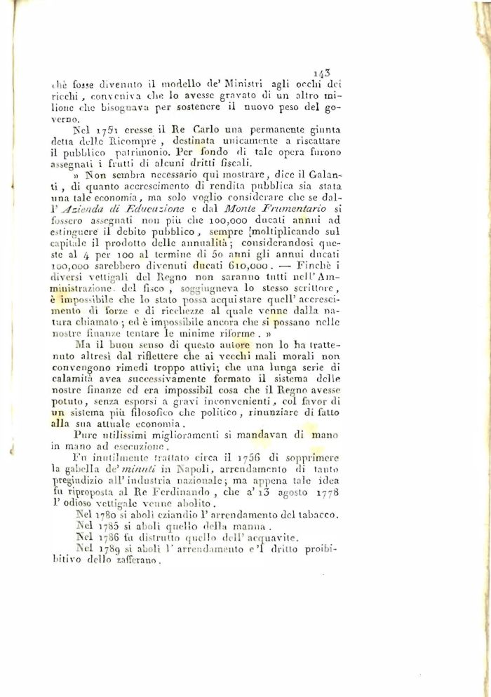 Ma il buon senso di quello autore non lo ha trattenuto altresì dal riflettere che ai vecchi mali morali non convengono rimedi troppo attivi; che una lunga serie di calamità avea successivamente formato il sistema delle nostre finanze ed era impossibil cosa che il Regno avesse potuto, senza esporsi a gravi inconvenienti, col favor di un sistema piìi filosofico clic politico, rinunziare di fallo alla sua attuale economia .