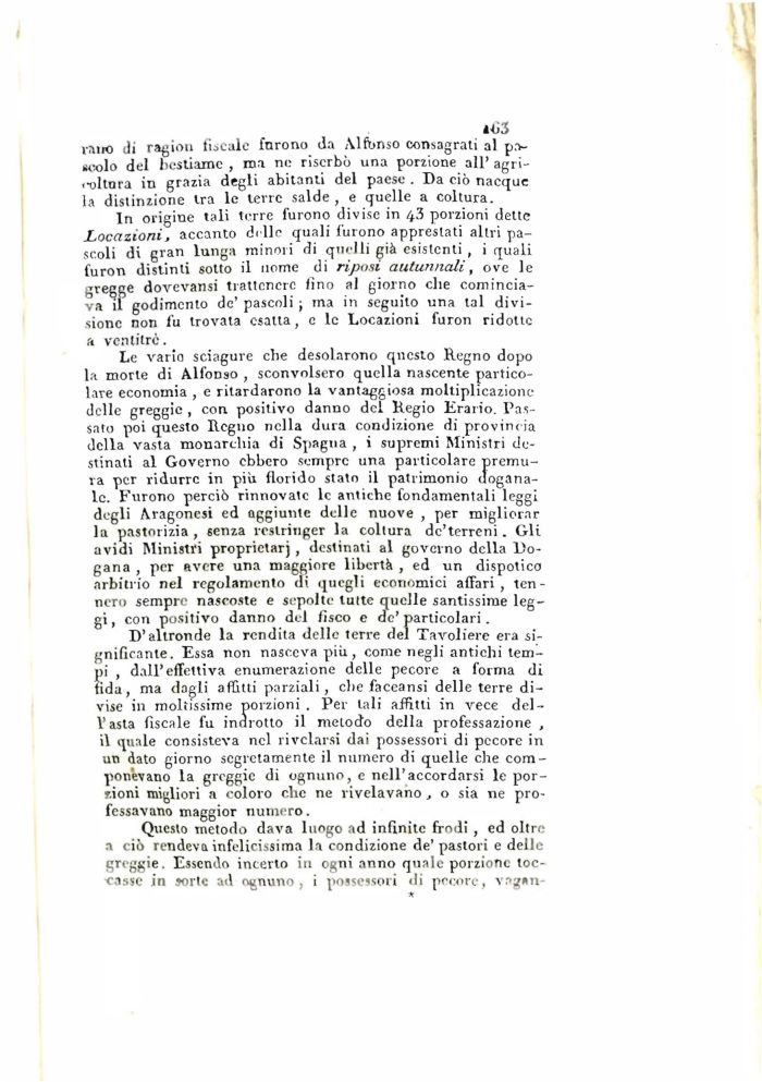 Le vario sciagure che desolarono questo Regno dopo la morte di Alfonso , sconvolsero quella nascente particolare economia , e ritardarono la vantaggiosa moltiplicazione delle greggio , con positivo danno del Regio Erario. Passato poi questo Regno nella dura condizione di provincia della vasta monarchia di Spagna , i supremi Ministri destinati al Governo ebbero sempre una particolare premura per ridurre in più florido stato il patrimonio doganale. Furono perciò rinnovate le antiche fondamentali leggi degli Aragonesi ed aggiunte delle nuove , per migliorar la pastorizia , senza restringer la coltura dc'terreni . Gli avidi Ministri proprictarj , destinati al governo della Dogana , per avere una maggiore libertà , ed un dispotico arbitrio nel regolamento eli quegli economici affari, tennero sempre nascoste e sepolte tutte quelle santissime leggi , con positivo danno del fisco e de' particolari.