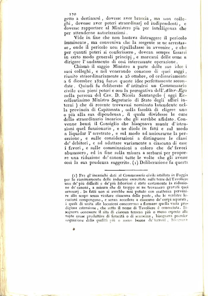 Chiamò il saggio Ministro a parte delle suo idee i suoi colleghi, e nel venerando consesso di quei saggi , riunito straordinariamente a a5 ottobre, ed ordinariamente a 6 dicembre 1824 furon queste idee perfettamente secondate . Quindi fu deliberato d' istituirsi un Commessario civile con pieni poteri e oou la prerogativa dell' Aliar-Ego nella persona del Cav. D. Nicola Santangelo ( oggi Eccellentissimo Ministro Segretario di Stato degli affari interni ) che di recente trovavasi nominato Intendente nella provincia di Capitanata , colla facoltà di eligere uno