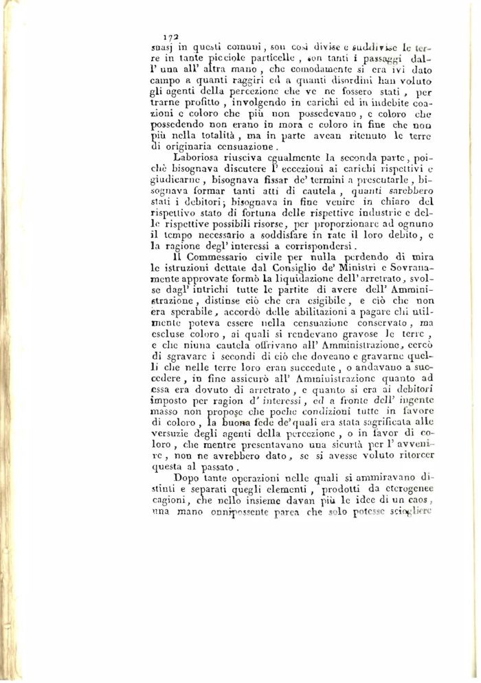 snasj in quegli comuni, sou co*i divise e sutLlirioC le terre in tante picciolo particelle , «on tanti i passaggi dall' una all' altra mano , chc comodamente si era ivi dato campo a quanti raggiri ed a quanti disordini han voluto gli Qgenti della percezione che ve ne fossero stati , per trarne profitto , involgendo in carichi ed in indebite coazioni c coloro chc più non possedevano , e coloro che possedendo non erano in mora c coloro in fiue chc non più nella totalità , ma in parte aveau ritenuto le terre di originaria censuazione .