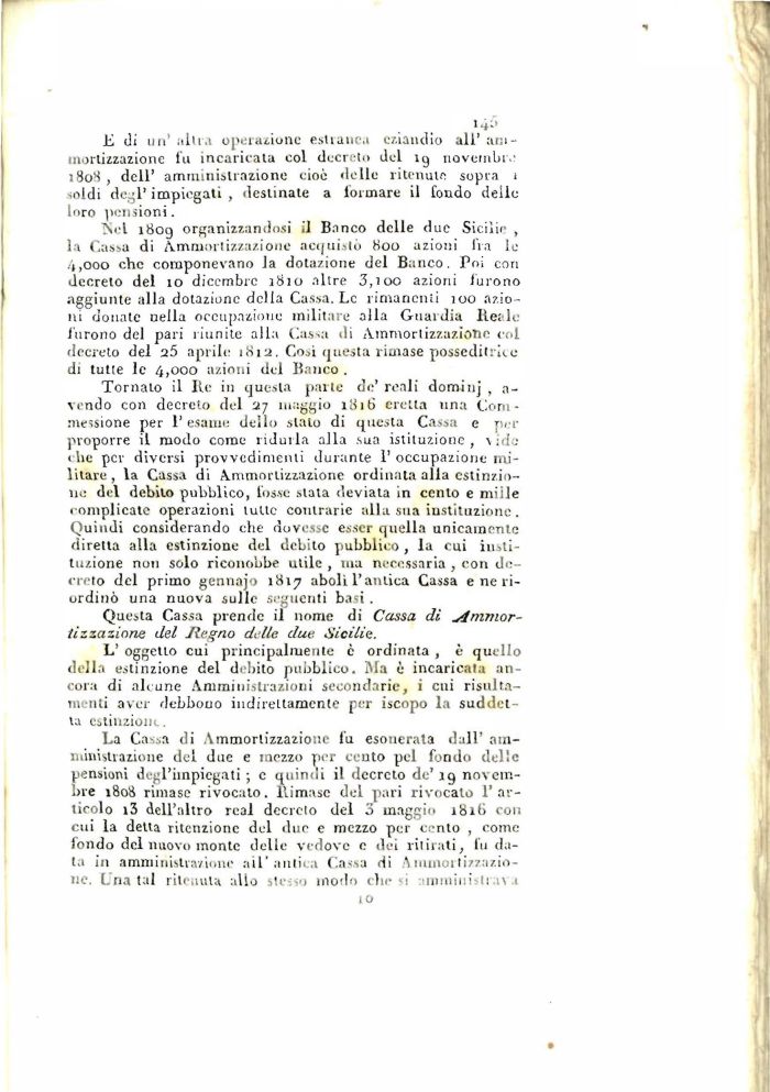 Nel 1809 organizzandosi il Banco delle due Sicilie , la Cassa di Ammortizzazione acquistò 800 azioni fra le 4,000 che componevano la dotazione del Banco. Poi cori decreto del 10 dicembre 1810 altre 3,100 azioni furono aggiunte alla dotazione della Cassa. Le rimanenti 100 azioni donate nella occupazione militare alla Guardia Re.'lc furono del pari riunite alla Cas>a di Ammortizzazione col decreto del 25 aprile 1812. Cosi questa rimase posseditrice di tutte le 4,000 azioni del Banco .