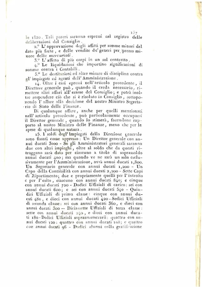 15. 1 soldi degl'Impiegati della Direzione generale sono fissati come appresso : Un Diretlor generale con annui ducali 3ooo - Se gli Amministratori generali saranno due con altri impieghi , oltre al soldo che da questi ritraggano sarà dato per ciascuno a titolo di soprassoldo annui ducati 400; ma quando ve ne sarà un solo esclusivamente per l'Amministrazione, avrà annui ducati 1,800. Un Segretario generale con annui ducati 1,200 - Un Capo della Contabilità con annui ducali 2,200 - Sette Capi di Hipariimento; due e propriamente quelli per l'introito c per l'esito, ciascuno con annui ducati 840; e cinque con annui ducati 720 - Dodici Uffiziali di carico : sei con annui ducati 600; e sei con annui ducati 540 - Quindici Uffiziali di prima classe : cinque con annui ducali 480, e dieci con annui ducali 420 - Sedici Uffiziali di seconda classe: sei con annui ducati 36o, c dieci con annui ducati 3oo — Diciassette Uffiziali di terza classe : sette con annui ducali 240 , e dieci con annui ducati 180-Dodici Uffiziali soprannumcrarii: quattro con annui ducali i2o: quattro con annui ducati 108; e quattro con annui ducati q6 - Dodici alunni colla gratili azione