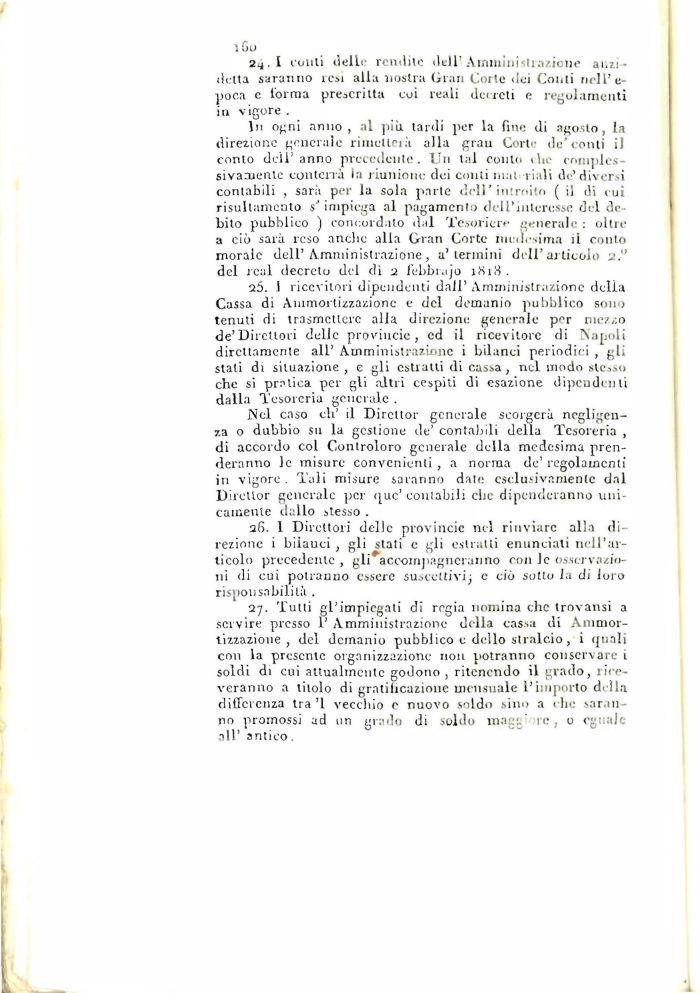 27. Tutti gl'impiegati di regia nomina chc trovatisi a servire presso 1' Amministrazione della cassa di Ammortizzazione , del demanio pubblico e dello stralcio, i quali con la presente organizzazione non potranno conservare i soldi di cui attualmente godono, ritenendo il grado, riceveranno a titolo di gratificazione mensuale l'importo della differenza tra '1 vecchio e nuovo soldo sino a che saranno promossi ad un grado di soldo magf.' re, o eguale all' antico.