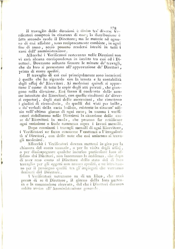 Allorché i Verificatori dovrai» mettersi in giro per la chiusura del conio annuale, o per la visita degli uffizi,, o per dissimpeg nare qualche incarico particolare loro ai-fidalo dal Direttori, non lasceranno la residenza . >-lu: dopo di aver reso conto al Direttore dello stalo del di loro travaglio per gli oggetti non ancora spedili, e ne istruì ranno per il prosieguo quelli tra gl impiegati che verranno destinati dal Direttore .