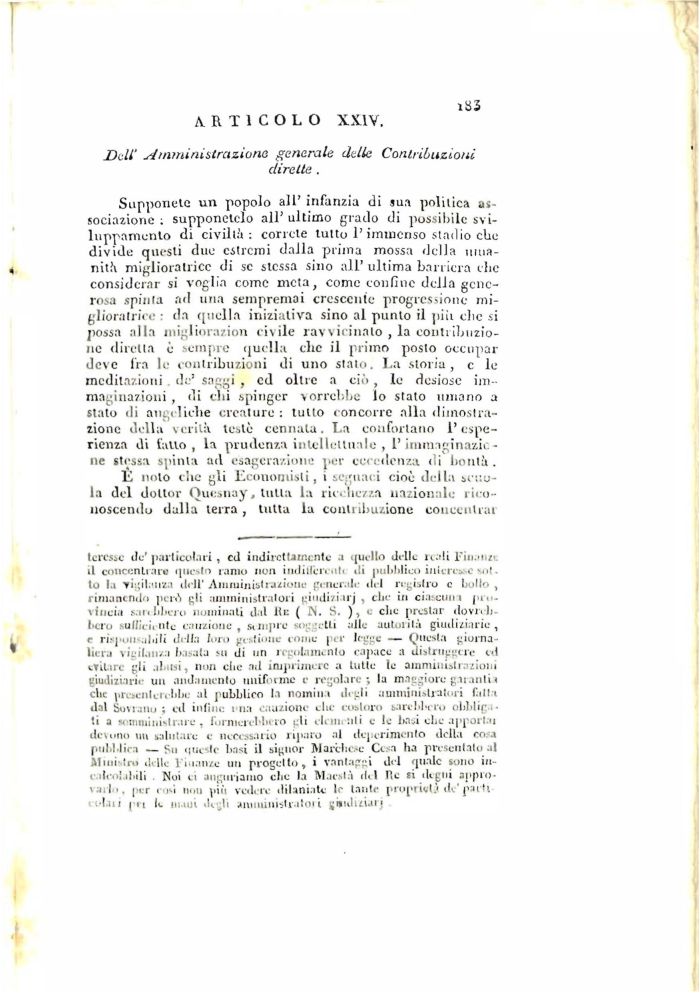Supponete un popolo all' infanzia di sua politica associazione : supponetelo all' ultimo grado di possibile svi-luppamonto di civiltà : correte tutto l'immenso stadio che divide questi due estremi dalla prima mossa della umanità miglioratrice di se stessa sino all' ultima barriera clic considerar si voglia come meta, come confine della generosa spinta ad una sempremai crescente progressione miglioratrice : da quella iniziativa sino al punto il piìi clic si possa alla migliorazion civile ravvicinalo , la contribuzione diretta è sempre quella clic il primo posto occupar deve fra lo contribuzioni di uno stato. La storia, c le meditazioni de' saggi , ed oltre a ciò, lo desiose immaginazioni , di chi spinger vorrebbe lo stato umano a stato di angeliche creature : tutto concorre alla dimostrazione della verità teste connata. La confortano l'esperienza di fallo, la prudenza intellettuale , l'immntjinazk -ne stessa spinta ad esagerazione per eccedenza di bontà .