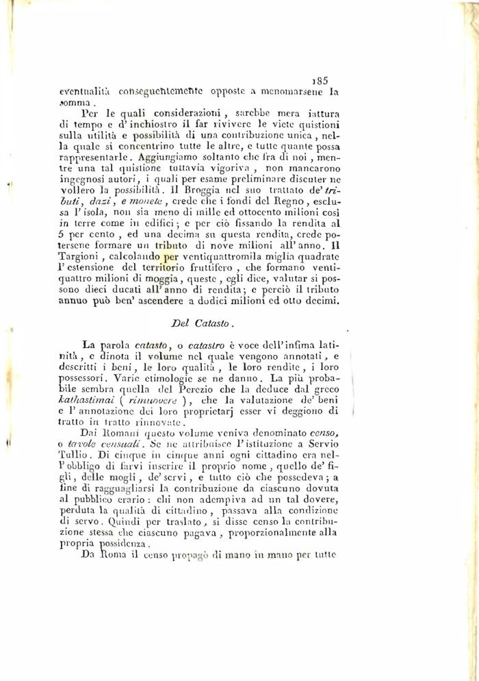 Per le quali considerazioni , sarebbe mera iattura di tempo e d'inchiostro il far rivivere le viete quistionì sulla utilità e possibilità di una contribuzione unica , nella quale si concentrino tutte le altre, e tutte quante possa rappresentarle. Aggiungiamo soltanto che ira di noi , mentre una tal quistione tuttavia vigoriva , non mancarono ingegnosi autori, i quali per esame preliminare discuter ne vollero la possibilità . Il Broggia nel suo trattato de' tri-liuti, dazi, e monete , crede clic i fondi del Regno , esclusa l'isola, non sia meno di mille ed ottocento milioni così in terre come in edifici ; e per ciò fissando la rendita al 5 per cento , ed una decima su questa rendita, crede potersene formare un tributo di nove milioni all'anno. 11 Targioni , calcolando per ventiquattromila miglia quadrate l'estensione del territorio fruttifero , che formano ventiquattro milioni di moggia, queste , egli dice, valutar si possono dieci ducati all'anno di rendita; e perciò il tributo annuo può ben' ascendere a dodici milioni ed otto decimi.