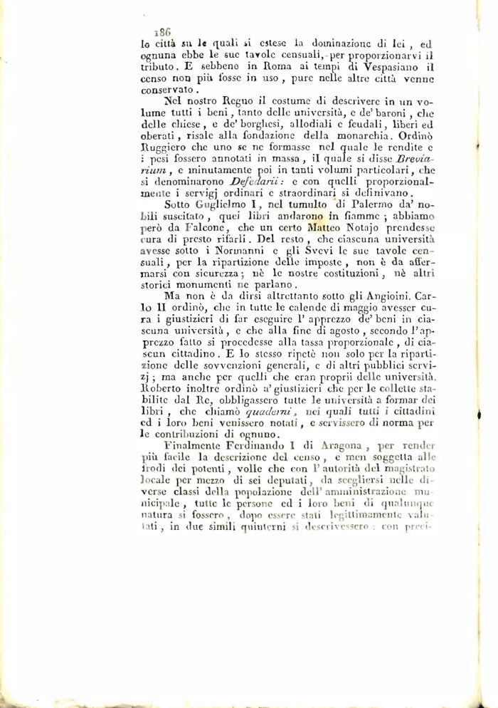 Nel nostro Regno il costume di descrivere in un volume tutti i beni , tanto delle università, e de'baroni , che delle chiese , e de' borghesi, allodiali e feudali, liberi ed oberati, risale alla fondazione della monarchia. Ordinò Ruggiero che uno se ne formasse nel quale le rendite e : pesi fossero annotati in massa , il quale si disse Brevici riunì, e minutamente poi in tanti volumi particolari, che si denominarono Defedarli: e con quelli proporzionalmente i servigj ordinari e straordinari si definivano.