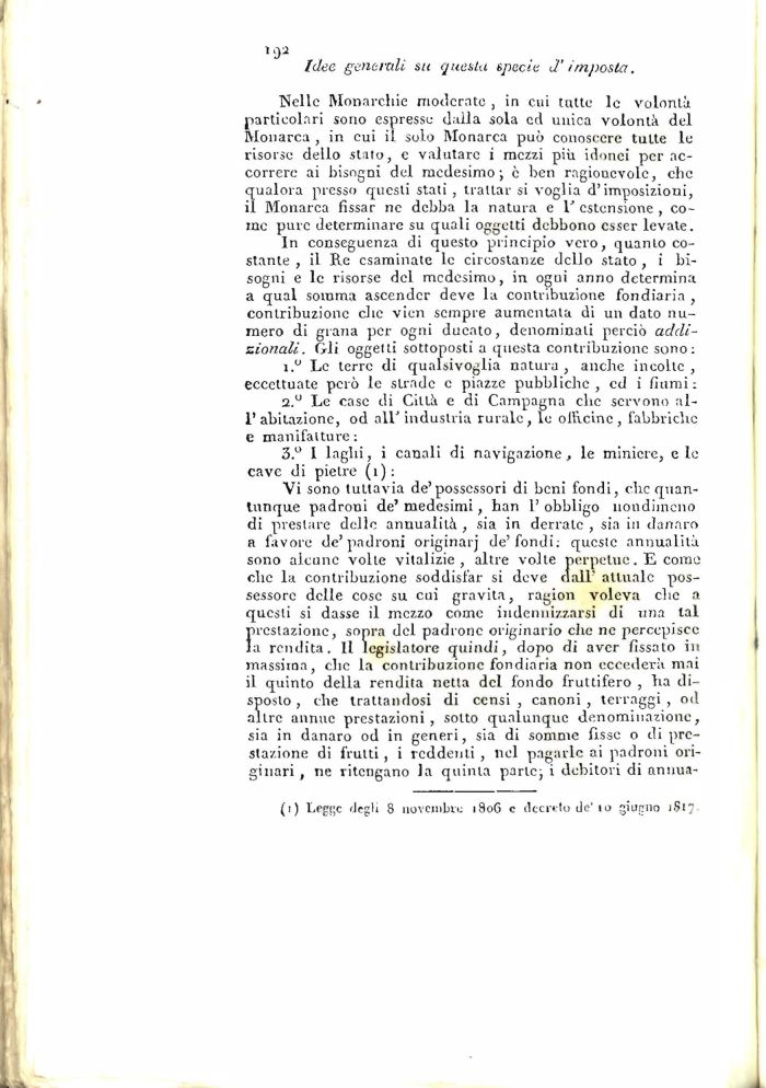 In conseguenza di questo principio vero, quanto costante , il Re esaminate le circostanze dello stato , i bisogni e le risorse del medesimo, in ogui anno determina a qual somma ascender deve la contribuzione fondiaria , contribuzione che vien sempre aumentata di un dato numero di grana per ogni ducato, denominali perciò addizionali. Gli oggetti sottoposti a questa contribuzione sono: