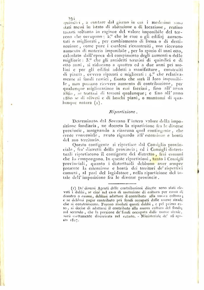 Questo conligcnle si ripartisce dal Consiglio provinciale , fra' distretti della provincia; ed i Consigli distrettuali ripartiscono il conligcnle del distretto , Irai comuni clic lo compongono. In queste ripartizioni , tanto i Consigli provinciali, quanto i distrettuali debbono aver sempre prescnle la estensione e bonlà dei territori de'rispedivi comuni , al pari del legislatore , nella ripartizione del totale dell'imposizione fra le diverse provincie.