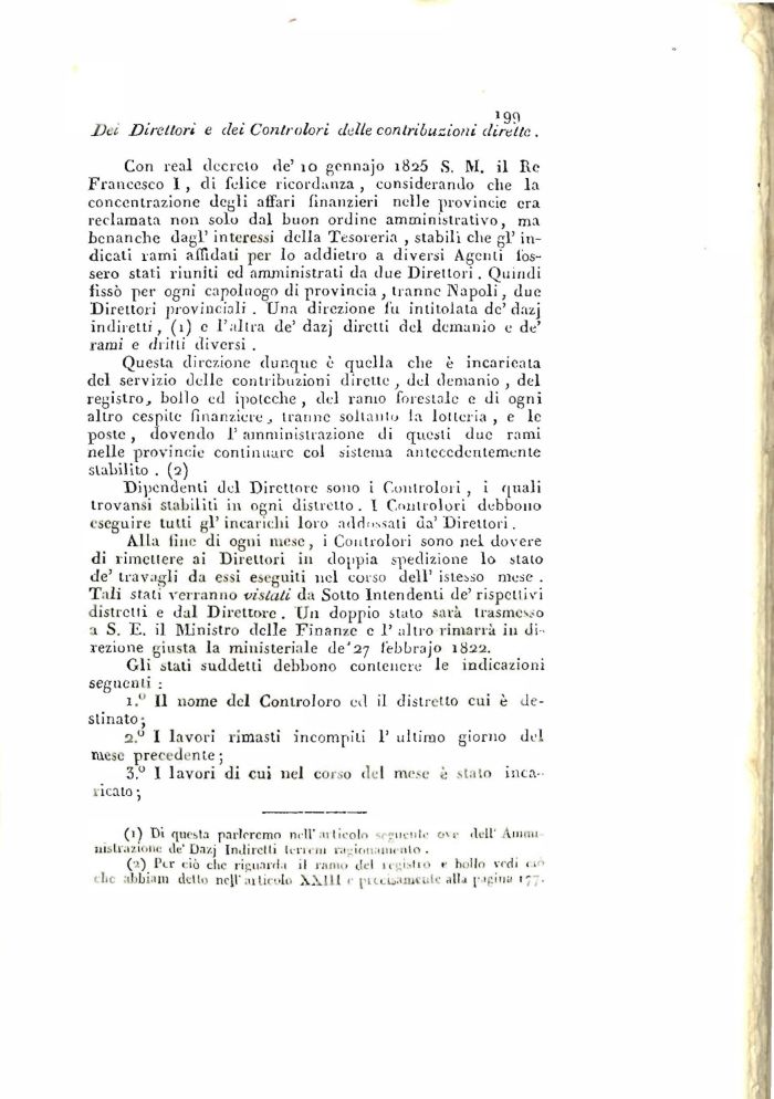 Con real decreto de' io gennajo 1825 S. M. il Re Francesco I , di felice ricordanza , considerando clie la concentrazione degli affari finanzieri nelle provincie era reclamata non solo dal buon ordine amministrativo, ma benanche dagl' interessi della Tesoreria , stabili che gl' indicati rami affidati per lo addietro a diversi Agenti fossero stati riuniti ed amministrati da due Direttori . Quindi fissò per ogni capoluogo di provincia , tranne Napoli, due Direttori provinciali . Una direzione fu intitolata de' dazj indiretti, (1) e l'altra de' dazj diretti del demanio e de' rami e dritti diversi .