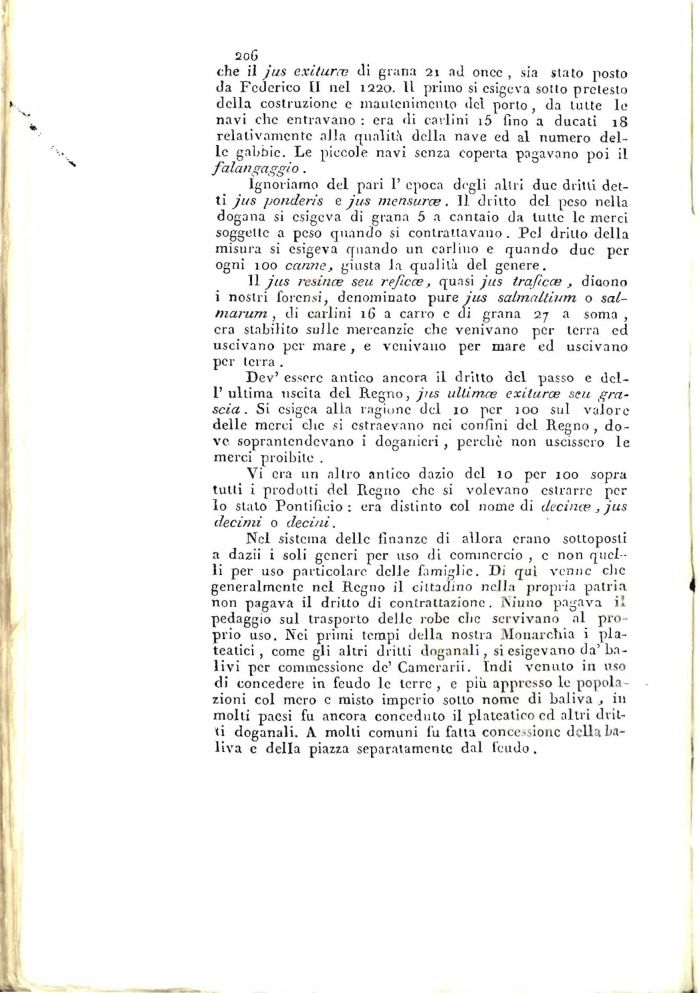 che il jus exiturce di grana 21 ad once , sia slato posto da Federico II nel 1220. Il primo si esigeva sotlo prelesto della costruzione e man leni mento del porto, da tutte le navi chc entravano : era di carlini i5 fino a ducati 18 relativamente alla qualitą della nave ed al numero delle gabbie. Le piccole navi senza coperta pagavano poi il falangaggio.