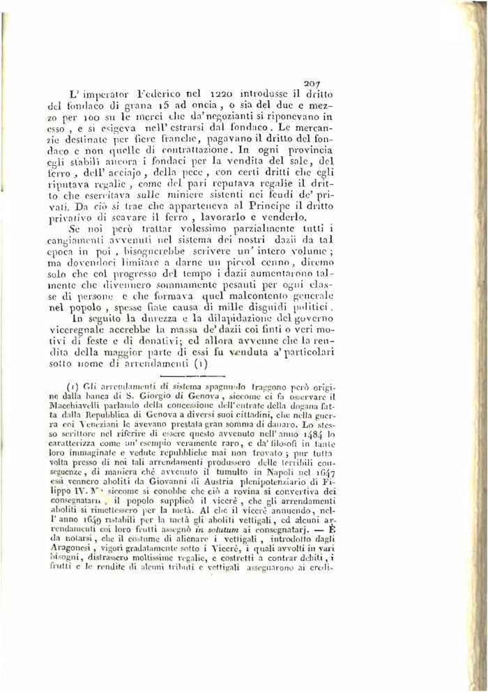 L' imperami* l'cdcrico nel 1220 introdusse il dritto del fondaco di grana i5 ad oncia, o sia del due e mezzo per 100 su le merci clic da'negozianti si riponevano in esso , e si esigeva nell' cstrarsi dal fondaco. Le mercanzie destinate per fiere franche, pagavano il dritto del fondaco c non quelle di contrattazione. In ogni provincia egli stabilì ancora i fondaci per la vendita del sale, del ferro, dell'aceiajo , della pece, con certi dritti chc egli riputava regalie , come del pari reputava regalie il dritto che esercitava sulle miniere sistcnti nei feudi de' privati. Da ciò si trae che apparteneva ni Principe il dritto privativo di scavare il ferro , lavorarlo e venderlo.