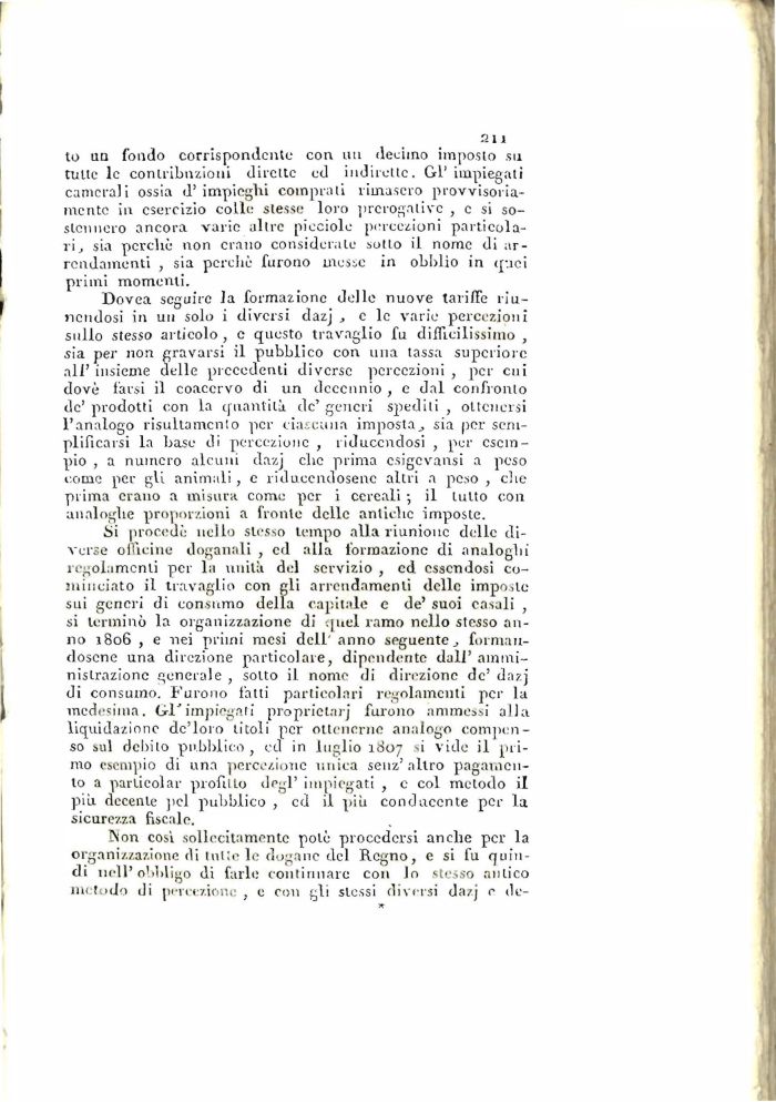 Si procede nello stesso tempo alla riunione delle diverse officine doganali , ed alla formazione di analoghi regolamenti per la unità del servizio , ed essendosi cominciato il travaglio con gli arrcudamenti delle imposto sui generi di consumo della capitale e de' suoi casali , si terminò la organizzazione di quel ramo nello stesso anno 1806 , e nei primi mesi dell anno seguente., formandosene una direzione particolare, dipendente dall' amministrazione generale , sotto il nome di direzione de' dazj di consumo. Furono fatti particolari regolamenti per la medesima. Gl'impiegati proprietarj furono ammessi alla liquidazione dc'loro titoli per ottenerne analogo compenso sul debito pubblico, ed in luglio 1807 si vide il primo esempio di una percezione unica senz'altro pagamento a parlieolar profitto dcgl' impiegati , c col metodo il più decenle pel pubblico , ed il più conducente per la sicurezza fiscale.