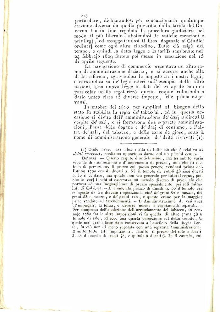 In ottobre del 1810 per supplirsi al bisogno dello stalo fu stabilita la regìa de' tabacchi ^ ed in questa occasione si divise dall' amministrazioni' de' dazj indiretti il cespite de' sali , e si l'ormarono due separate amministrazioni, l'ima delle dogane e de'dazi di consumo, e l'altra de' sali, del tabacco, e delle carie da gioco, sollo il nome di amministrazione generale de' drilli riservati (1).