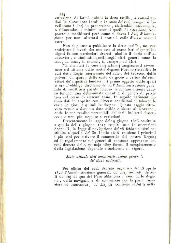 Per effetto del real decreto organico de' i3 aprile 182G l'Amministrazione generale de'dazj indiretti dc'rea-li doniinj di qua del Faro abbraccia i rami delle dogane , della navigazione di commercio per la parte finanziera ed economica , de' dazj di consumo stabiliti nclJa
