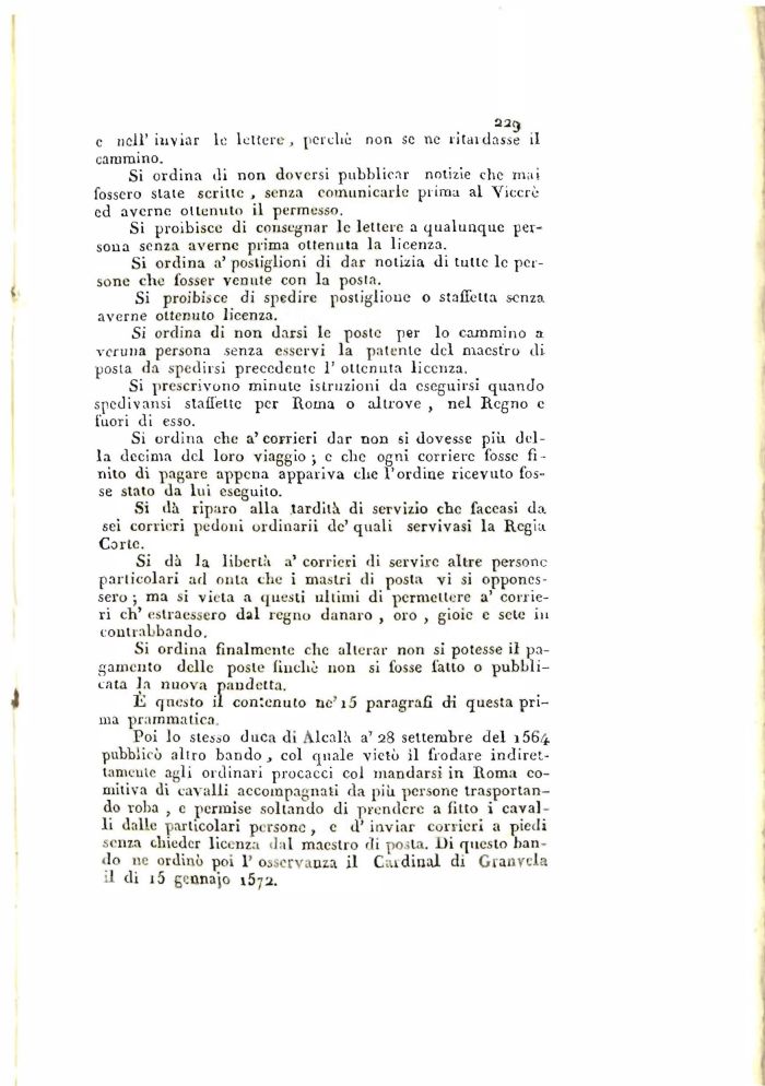 Poi lo stesso duca di Àlcalà a'28 settembre del i564 pubblicò altro bando , col quale vietò il frodare indirettamente agli ordinari procacci col mandarsi in Roma comitiva di cavalli accompagnati da più persone trasportando roba , e permise soltando di prendere a fitto i cavalli dalle particolari persone, e d'inviar corrieri a piedi senza chieder licenza dal maestro di posta. l)i questo bando ne ordinò poi 1' osservanza il Cutdinal di Granycla il di i5 gennajo \5-j2.