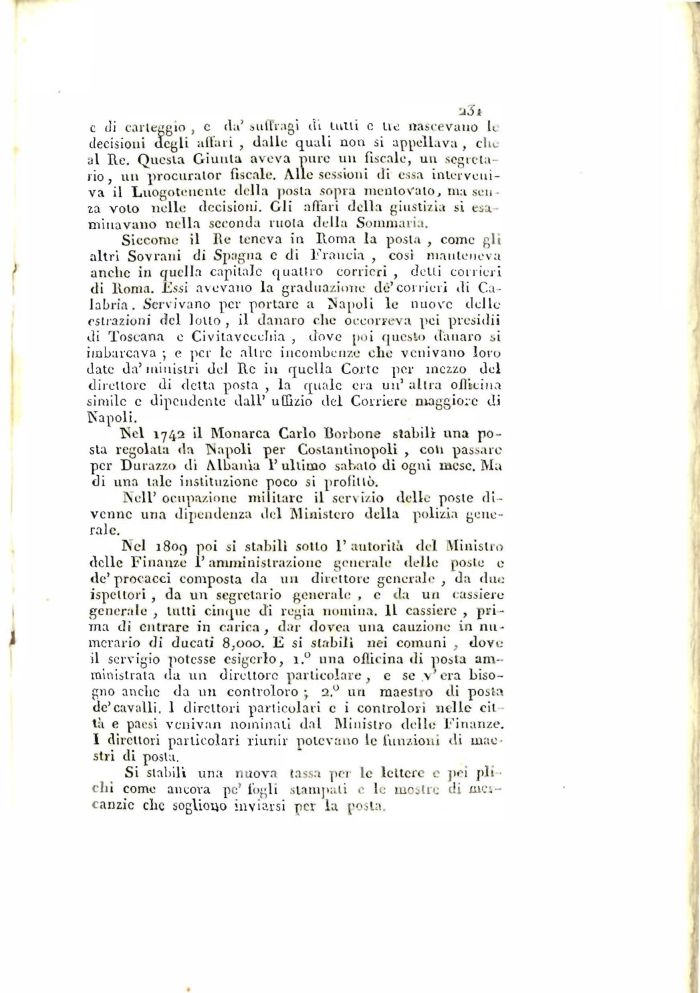 Siccome il Re teneva in Roma la posta , come gli altri Sovrani di Spagna e di Francia , così manteneva anche in quella capitale quattro corrieri , detti coi rieri di Roma. Essi avevano la graduazione dé'corrieri di Calabria. Servivano per portare a Napoli le nuove delle estrazioni del lotto , il danaro che occorreva pei presidii di Toscana c Civitavecchia , dove poi questo danaro si imbarcava ; e per le altre incombenze ohe venivano loro date da'ministri del Re in quella Corte per mezzo del direttore di detta posta , la quale eia un' altra officina simile e dipendente dall' uffizio del Corriere maggiore di Napoli.