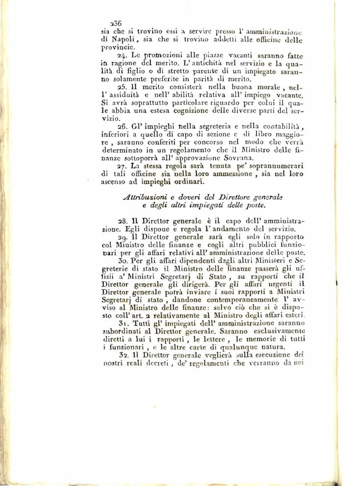 31. Tutti gì' impiegati dell' amministrazione saranno subordinati al Dircttor generale. Saranno esclusivamente diretti a lui i rapporti , le lettere , le memorie di lutti i funzionari , e le altre carte di qualunque natura.