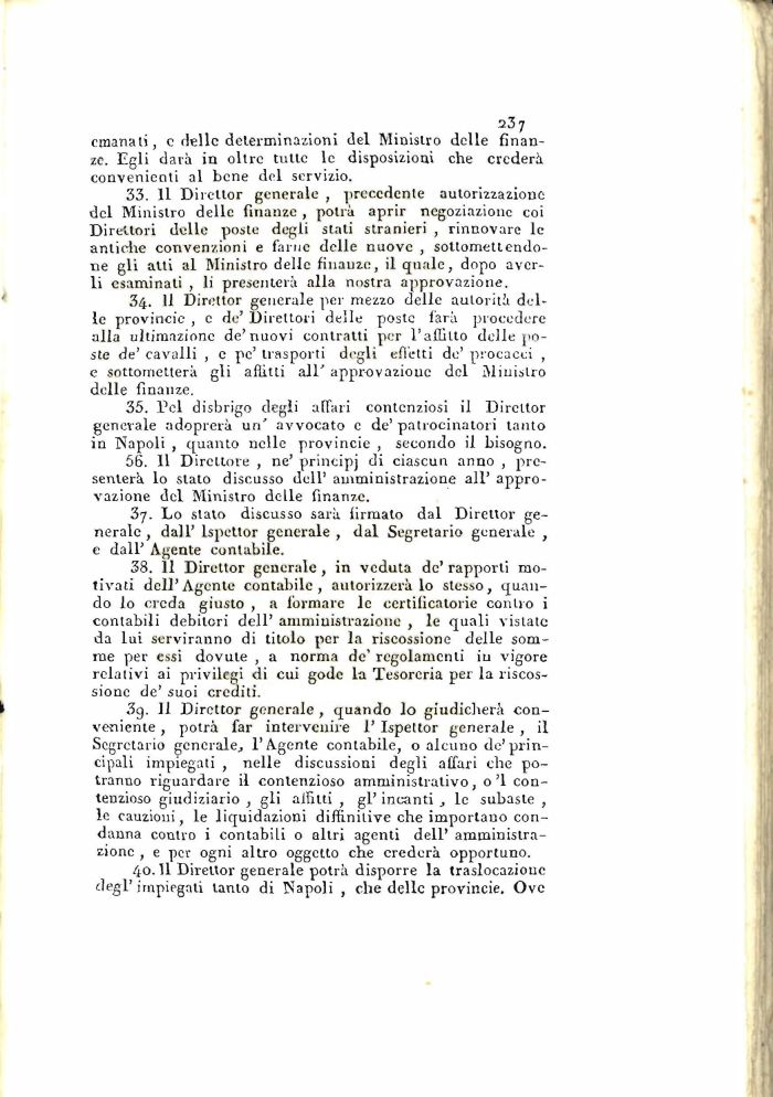 33. Il Dircllor generale , precedente autorizzazione del Ministro delle finanze , potrà aprir negoziazione coi Direttori delle poste degli stati stranieri , rinnovare le antiche convenzioni e farne delle nuove , sottomettendone gli alti al Ministro delle finanze, il quale, dopo averli esaminati , li presenterà alla nostra approvazione.