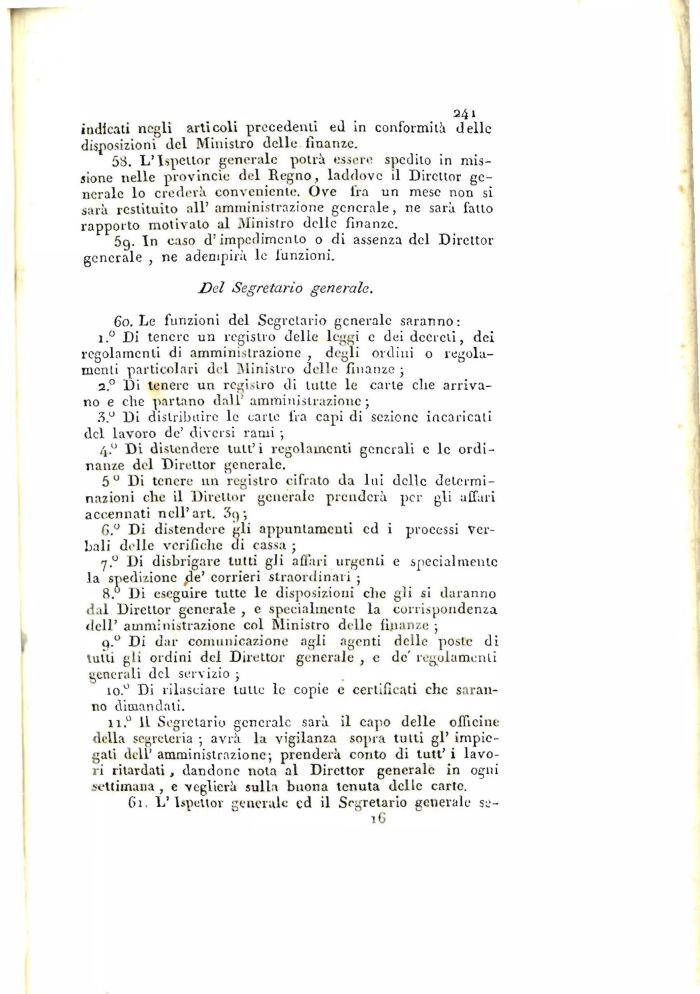 11.° Il Segretario generale sarà il capo delle officine della segreteria ; avrà la vigilanza sopra tutti gì' impiegati dell' amministrazione; prenderà conto di tutt' i lavori ritardati , dandone nota al Direttor generale in ogni settimana , e veglierà sulla buona tenuta delle carte.