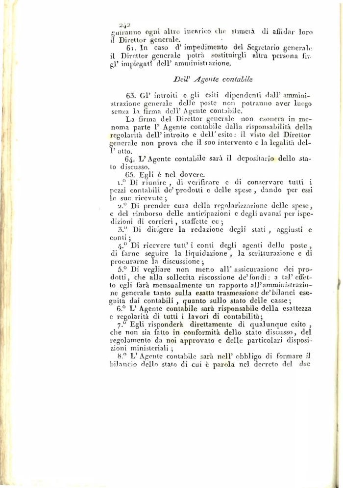 63. GÌ' introiti e gli esiti dipendenti dall' amministrazione generale delle poste non potranno aver luogo senza la firma dell' Agente contabile.