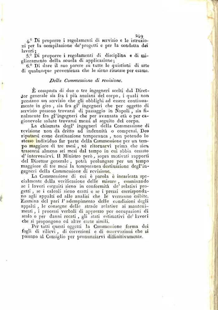 È composta di duo o irò ingegneri scelli dal Diret-Jor generale sia fra i più anziani del corpo, i quali non prestano un servizio che gli obblighi ad essere continuamente in giro , sia fra gl' ingegneri che per oggetto di servizio possono trovarsi di passaggio in Napoli , sia finalmente fra gl'ingegneri che per avanzata età o per cagionevole salute trovansi messi al seguito del corpo.