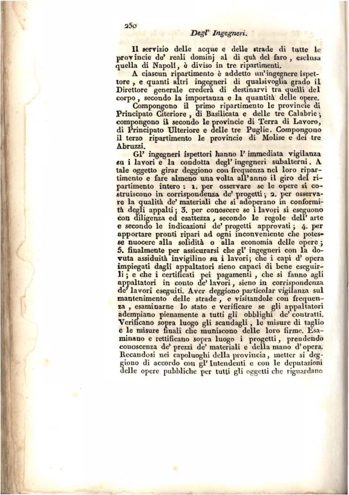 GÌ' ingegneri ispettori hanno 1' immediata vigilanza eu i lavori e la condotta dogi' ingegneri subalterni. A tale oggetto girar deggiono con frequenza nel loro ripartimento e fare almeno una volta all'anno il giro del ripartimento intero ; ». per osservare se le opere si costruiscono in corrispondenza de' progetti -, 2. per osservare la qualità de' materiali che si adoperano in conformità degli appalti ; 3. per conoscere se i lavori si eseguono con diligenza ed esattezza , secondo le regole dell' arte c secondo le indicazioni de' progetti approvati ; 4. per apportare pronti ripari ad ogni inconveniente che potesse nuocere alla solidità o alla economia delle opere ; 5. finalmente per assicurarsi che gl' ingegneri con la dovuta assiduità invigilino su i lavori; che i capi d' opera impiegati dagli appaltatori sieno capaci di bene eseguirli ; e che i certificali pei pagamenti , che si fanno agli appaltatori in conto de' lavori, sicno in corrispondenza de lavori eseguiti. Aver deggiono particolar vigilanza sul mantenimento delle strade , e visitandole con frequenza , esaminarne lo stato e verificare se gli appaltatori adempiano pienamente a tutti gli obblighi de' contratti. Verificano sopra luogo gli scandagli , le misure di taglio c le misure finali che muniscono delle loro firme. Esaminano e rettificano sopra luogo i progetti, prendendo conoscenza de' prezzi de' materiali e della mano d'opera. Recandosi nei capoluoghi della provincia, metter si deggiono di accordo con gl' Intendenti c con le deputazioni delle opere pubbliche per tutù gli oggetti clic riguardano