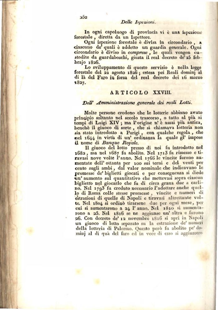 Il giuoco del lollo presso di noi fu introdotto nel 1682, ma nel 1687 fu abolito. Nel 1713 fu rimesso e ti-ravasi nove volle l'anno. Nel 176610 vincile furono aumentale dell' ollanta per 100 sui terni e del venti per cento sugli ambi , dal valor nominale che indicavano le promesse de' biglietti giocali e per conseguenza si diede «in' aumento sul quantitativo che mctlevasi sopra ciascun biglietto nel giocarlo che fu di circa grana due a carlino. Nel 1793 fu credulo necessario l'adottare anche quello di Roma colle stesse promesse , vincite e numeri di estrazioni di quelle di Napoli e tiravasi altrettante volte. Nel 1804 si ordinò tirarsene due per ogni mese, per cui si aumentarono a 24 l'anno. Nel 1810 si aumentarono a 25. Nel 1816 se ne aggiunse un' altra e furono 26. Con decreto de' 12 novembre vBifi si apri in Napoli un giuoco di lotto separalo su la estrazione de' numeri della lotteria di Palermo. Questo però fu abolito pc' dominj al di quà del faro ed in vccc di esso si aggiunsero