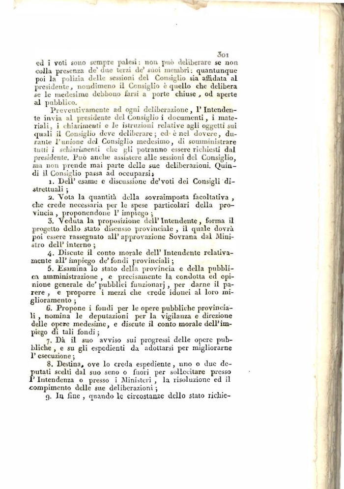 Preventivamente ad ogni deliberazione , l'Intendente invia al presidente del Consiglio i documenti, i materiali, i chiarimenti e le istruzioni relative agli oggetti sui quali il Consiglio deve deliberare; ed ènei dovere, durante l'unione del Consiglio medesimo, di somministrare tutti i schiarimenti che gli potranno essere richiesti dal presidente. Può anche assistere alle sessioni del Consiglio, ma non prende mai parte dello sue deliberazioni. Quindi il Consiglio passa ad occuparsi j