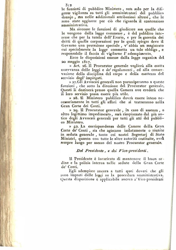 » Art. 26. Il Procurator generale veglierà alla esatta osservanza delle leggi e de' regolamenti , ed alla conservazione della disciplina del corpo e della esattezza del servizio degl' impiegati.