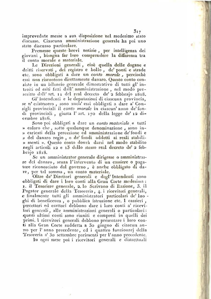 Le Direzioni generali , cioè quella delle dogane e dritti riservati , del registro e bollo , de' ponti e strade eie. sono obbligati a dare un conio morale , perciochè essi non riscuotono direttamente danaro. Questo conto consiste in un bilancio generale dimostrativo di tutti gl' introiti ed esiti latti dall' amministrazione , nel modo prescritto dall'art, 11 del real decreto de'2 febbrajo 1818.