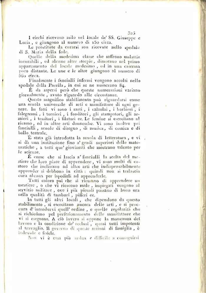 Quelle della medesima classe che soffrono malattie incurabili , ed alcune altre storpie, dimorano nel primo appartamento del locale medesimo , ed in una caserma poco distante. Le une e le altre giungono ol numero di 50o circa.