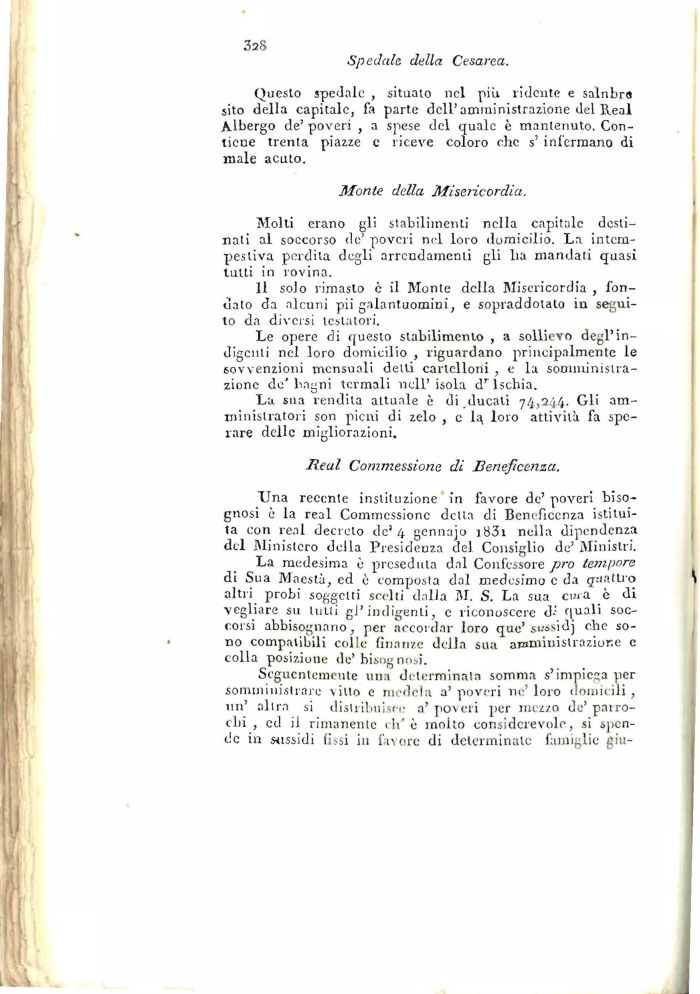 Una recente instiluzione in favore de' poveri bisognosi è la real Commessione della di Beneficenza istituita con real decreto de1 4 gennajo i83i nella dipendenza del Ministero della Presidenza del Consiglio de' Ministri.