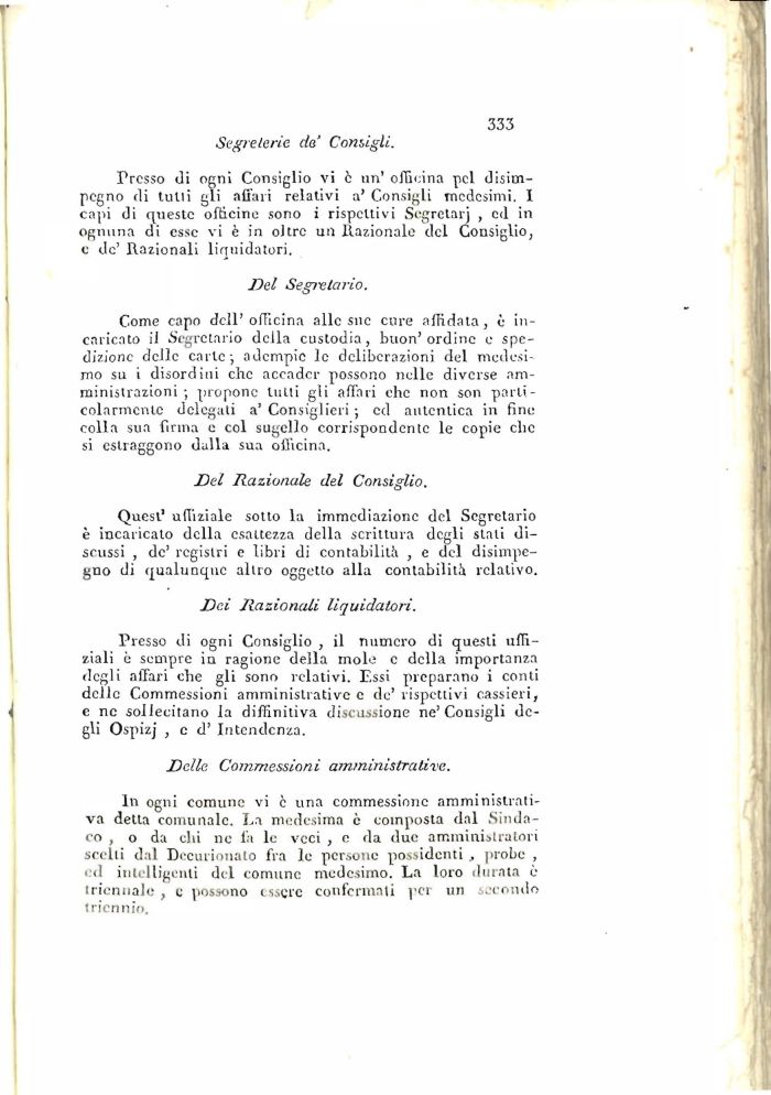 In ogni comune vi c una commessione amministrativa detta comunale. La medesima e composta dal Sindaco , o da chi ne fa le veci , e da due amministratori scolti dal Decurionato fra lo persone possidenti , probe , eri intelligenti del comune medesimo. La loro durata è triennale , e possono essere confermati per un secondo triennio.