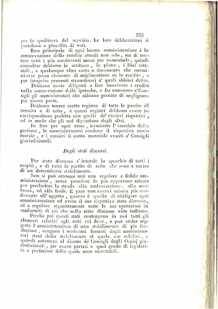 Perchè poi questi stati contendono in essi lutti gli clementi relativi agli esili cui deve , o può andar soggetta 1' amministrazione di uno stabilimento di pia fondazione , vengono i medesimi formali dagli amministratori stessi delio stabilimento al quale son relativi, e quindi sottomessi al disamo de'Consigli degli Ospizj giurisdizionali , per essere portati a quel grado di regolarità c perfezione della quale sono susccllibili.