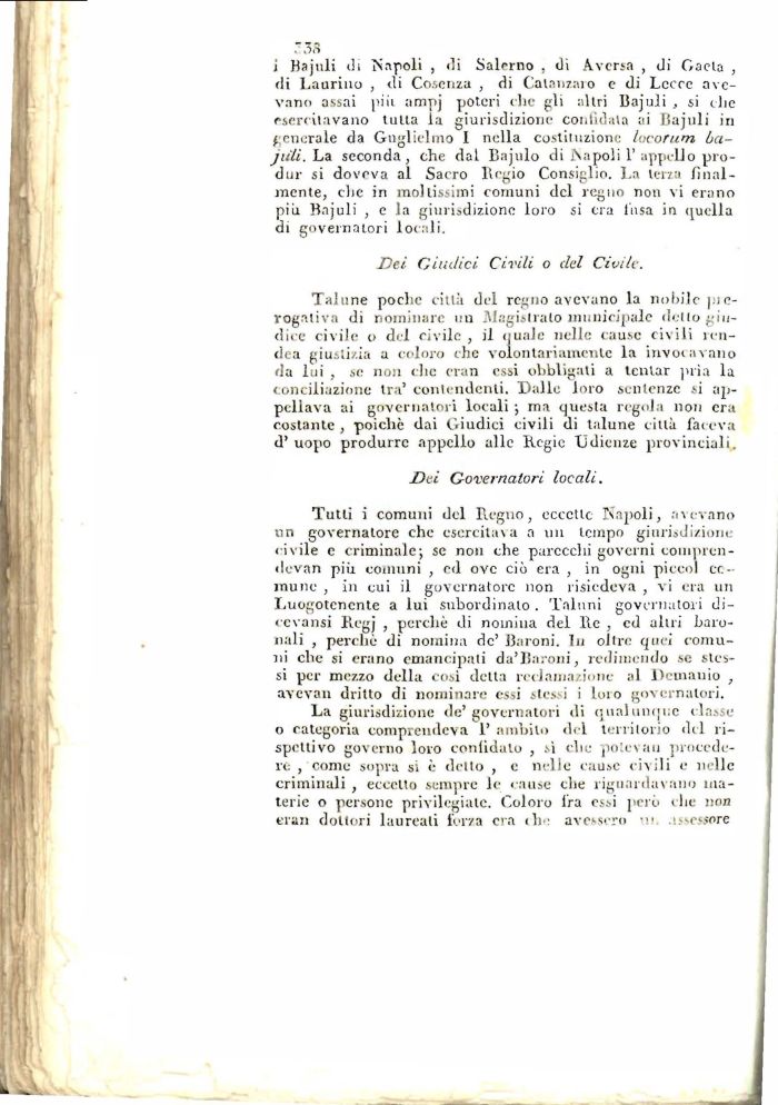 Tutti i comuni del Regno, eccctlc Isapoli, avevano un governatore che esercitava a un tempo giurisdizione civile e criminale; se non che parecchi governi couiprcn-devan più comuni , ed oyc ciò era , in ogni picco! ce-ninne , in cui il governatore non risiedeva , vi era un Luogotenente a lui subordinato . Taluni governatori di-cevansi Regj , perchè di nomina del Re , ed altri baronali , perchè di nomina de' Baroni. In oltre quei comuni che si erano emancipati da'IJaroni, redimendo se stessi per mezzo della così detta reclamazione al Demanio , avevan dritto di nominare essi stessi i loro governatori.