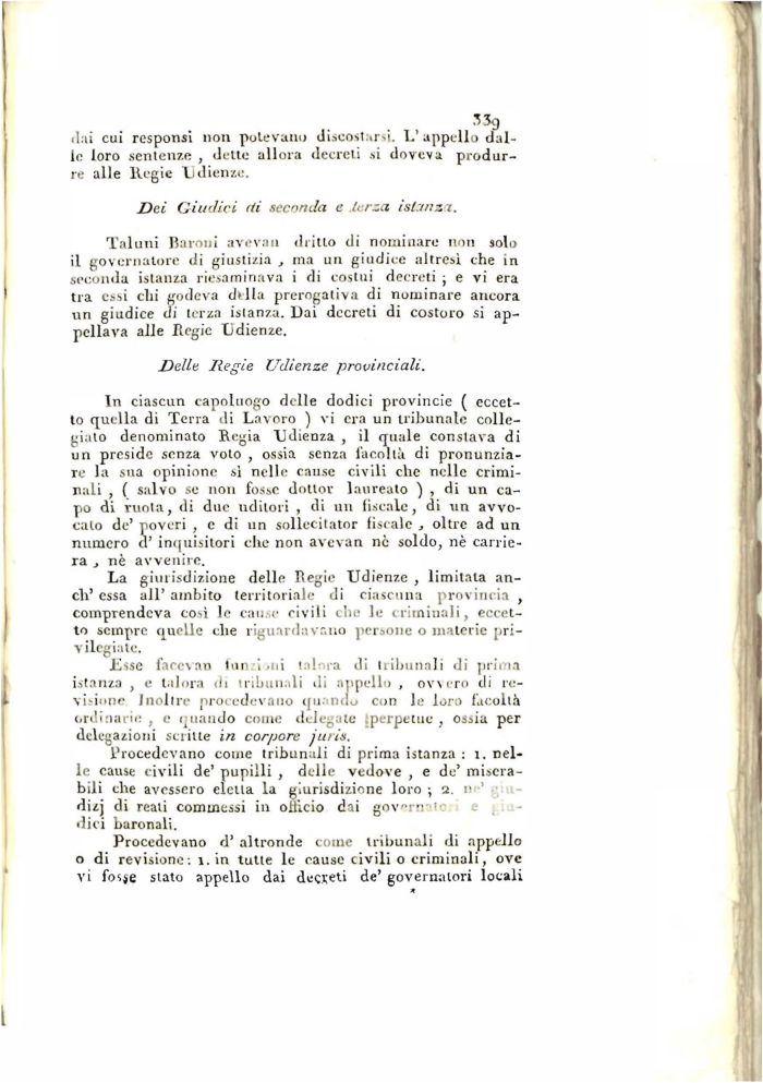 Taluni Baroni aveva 11 dritto di nominare non solo il governatore di giustizia , ma un giudice altresė che in seconda istanza riesaminava i di costui decreti ; e vi era tra essi chi godeva dilla prerogativa di nominare ancora un giudice di terza istanza. Dai decreti di costoro si appellava alle Regie Udienze.