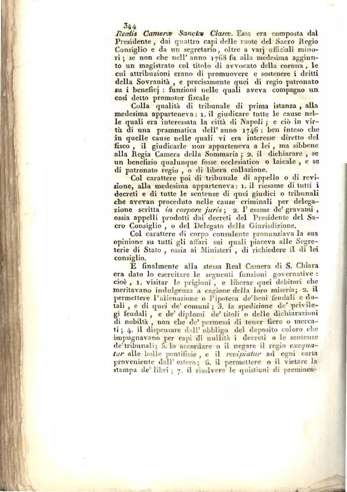 E finalmente alla stessa Real Camera di S. Chiara era dato lo esercitare le seguenti funzioni governative : cioè , 1. visitar le prigioni , e liberar quei debitori che meritavano indulgenza a cagione della loro miseria; 2. il permettere l'alienazione o l'ipoteca de'beni feudali e dotali , e di quei de' comuni ; 3. la spedizione de' prvv ilo-gi feudali , e de' diplomi de' titoli o delle dichiarazioni di nobiltà , non che de' permessi di tener fiere o mercati ; 4. il dispensare dall' obbligo del deposito coloro clic impugnavano per capi di nullità i decreti o le sentenze de: tribunali; 5. lo accordare o il negare il regio exccjua-tur alle bolle pontificie , e il recipiatur ad ogni carta proveniente dall'estero; 6. il permettere o il vietare la stampa de' libri ; 7. il risolvere le quistiani di premine»-
