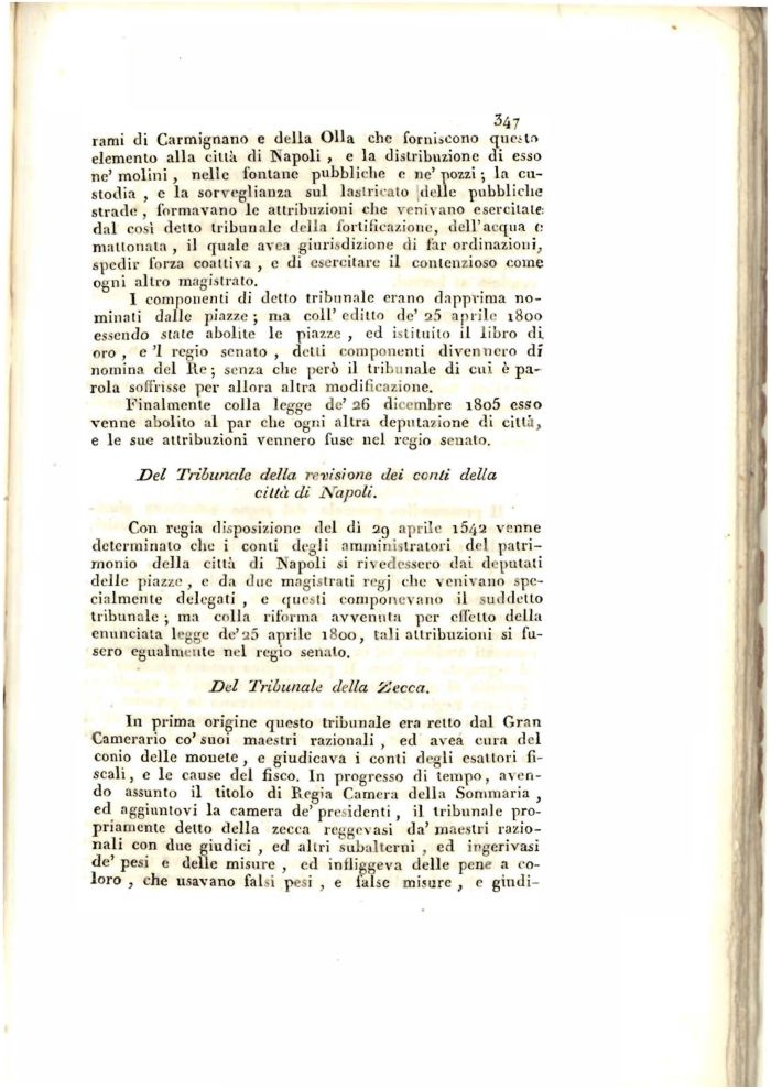 Con regia disposizione del di 29 aprile i542 venne detcrminato clic i conti degli amministratori del patrimonio della città di Napoli si rivedessero dai deputati delle piazze, e da due magistrati regj clic venivano specialmente delegati , e questi componevano il suddetto tribunale ; ma colla riforma avvenuta per effetto della enunciata legge de'25 aprile 1800, tali attribuzioni si fusero egualmente nel regio senato.