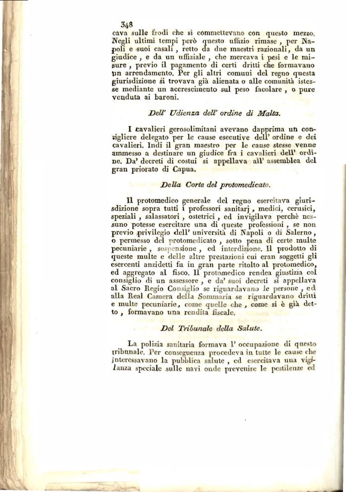 II protomedico generale del regno esercitava giurisdizione sopra tutti i professori sanitarj , medici, cerusici, speziali , salassatoli , ostetrici , ed invigilava perche nessuno potesse esercitare una di queste professioni , se non previo privilegio dell' università di Napoli o di Salerno , o permesso del protomedicato , sotto pena di certe multe pecuniarie , sospensione , ed interdizione. 11 prodotto di queste multe e delle altre prestazioni cui eran soggetti gli esercenti anzidetti fu in gran parte ritolto al protomedico, ed aggregato al fisco. Il protomedico rcndea giustizia col consiglio di un assessore , e da' suoi decreti si appellava al Sacro Regio Consiglio se riguardavano le persone , ed alla Real Camera della Sommaria se riguardavano dritti e multe pecuniarie, come quelle che , come si è già detto , formavano lina rendita iiscale.