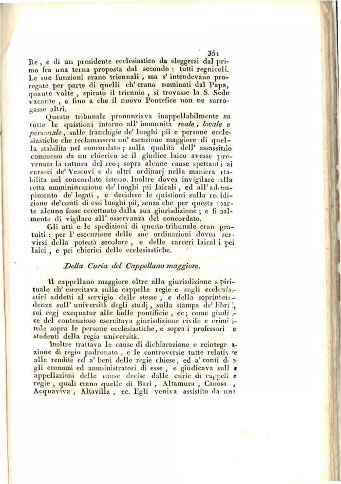 11 cappellano maggiore oltre alla giurisdizione s piri tuale eli' esercitava sulle cappelle regie e sugli eeclosrn.-stici addetti al servigio delle stesse , c della soprinteii -denza sull' universitą degli studj , sulla stampa de' libri ', sui regj excquatur alle bolle pontificie , ec; come giudi -ce del contenzioso esercitava giurisdizione civile e crimi i-nale sopra le persone ecclesiastiche, e sopra i professori e studenti della regia universitą.