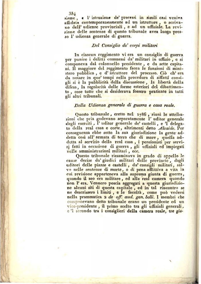 In ciascun reggimento vi era un consiglio di guerra per punire i delitti commessi da' militari in uffizio , e si componeva dal colonnello presidente , e da sette capitani. Il maggiore del reggimento facca le funzioni di ministero pubblico , e d'istruttore del processo. Ciò eh' era da notare in que' tempi nella procedura di siffatti consigli si è la pubblicità della discussione , la libertà della difesa, la regolarità delle forme esteriori del dibattimento , cose tutte che si desiderava fossero praticate in tutti gli altri tribunali.