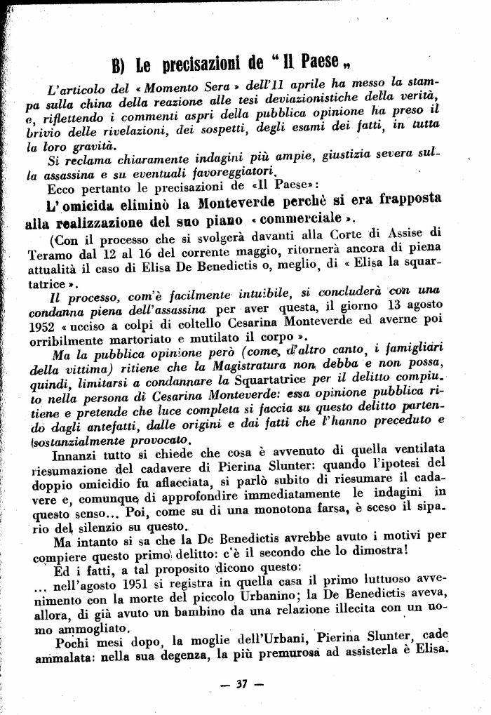 Ma la pubblica opinione però (come, df altro canto, i famigliàri della vittima) ritiene che la Magistratura non debba e non possa, quindi, limitarsi a condannare la Squartatrice per il delitto compiu. to nella persona di Cesarina Monteverde: essa opinione pubblica ritiene e pretende che luce completa si faccia su questo delitto partendo dagli antefatti, dalle origini e dai fatti che l'hanno preceduto e (sostanzialmente provocato.
