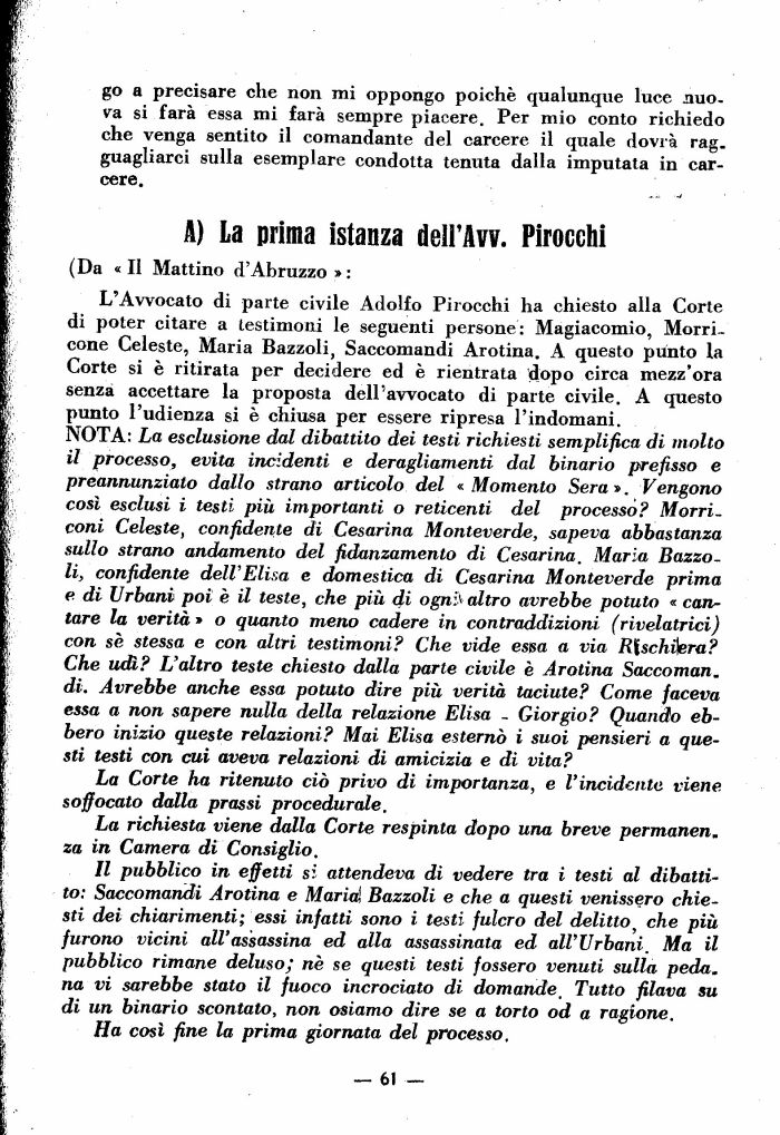 L'Avvocato di parte civile Adolfo Pirocchi ha chiesto alla Corte di poter citare a testimoni le seguenti persone: Magiacomio, Morri-cone Celeste, Maria Bazzoli, Saccomandi Arotina. A questo punto la Corte si è ritirata per decidere ed è rientrata dopo circa mezz'ora senza accettare la proposta dell'avvocato di parte civile. A questo punto l'udienza si è chiusa per essere ripresa l'indomani. NOTA: La esclusione dal dibattito dei testi richiesti semplifica di molto il processo, evita incidenti e deragliamenti dal binario prefisso e preannunzialo dallo strano articolo del «Momento Sera». Vengono così esclusi i testi più importanti o reticenti del processo? Morri-coni Celeste, confidente di Cesarina Monteverde, sapeva abbastanza sullo strano andamento del fidanzamento di Cesarina. Maria Buzzo, li, confidente dell'Elisa e domestica di Cesarina Monteverde prima e. di Urbani poi è il teste, che più di ogn% altro avrebbe potuto « cantare la verità » o quanto meno cadere in contraddizioni (rivelatrici) con sé stessa e con altri testimoni? Che vide essa a via Rischiara? Che udì? L'altro teste chiesto dalla parte civile è Arotina Saccoman. di. Avrebbe anche essa potuto dire più verità taciute? Come faceva essa a non sapere nulla della relazione Elisa - Giorgio? Quando ebbero inizio queste relazioni? Mai Elisa esternò i suoi pensieri a questi testi con cui aveva relazioni di amicizia e di vita?
