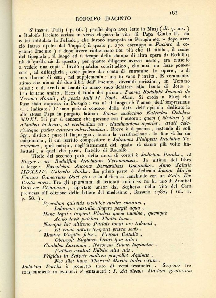 per Rodulfum Iracintum Teramanum . In ultimo del libro si legge : Excudebat Ancona Bernardinus Gueraldus . Anno Salutis MDXXIV. Calendìs Aprilis. La prima parte è dedicala Joanni Maria Varano Canteriium Duci etc: e la dedica si conchiude con un Vale. Ex Civita nova . Fra gli epigrammi di letterali amici ve ne ha uno di Annibal Caro ex Civitanova