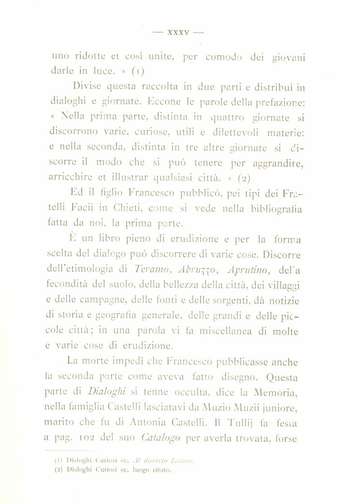 La morte impedì che Francesco pubblicasse anche la seconda parte come aveva fatto disegno. Questa parte di Dialoghi si tenne occulta, dice la Memoria, nella famiglia Castelli lasciatavi da Muzio Muzii juniore, marito che fu di Antonia Castelli. 11 Tullij fa festa a pag. 102 del suo Catalogo per averla trovata, forse