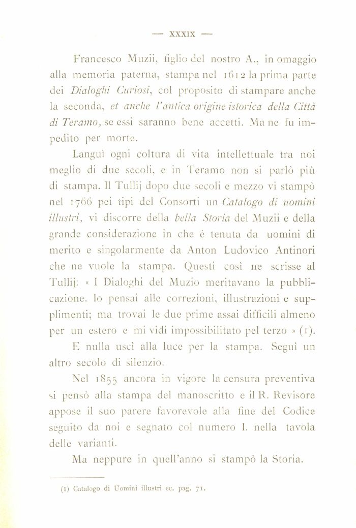 Languì ogni coltura di vita intellettuale tra noi meglio di due secoli, e in Teramo non si parlò più di stampa. 11 Tulli] dopo due secoli e mezzo vi stampò nel 1766 pei tipi del Consorti un Catalogo di uomini illustri, vi discorre della bella Storia del Muzii e della grande considerazione in che è tenuta da uomini di merito e singolarmente da Anton Ludovico Antinori che ne vuole la stampa. Questi così ne scrisse al Tulli): « 1 Dialoghi del Muzio meritavano la pubblicazione. lo pensai alle correzioni, illustrazioni e sup-plimenti; ma trovai le due prime assai difficili almeno per un estero e mi vidi impossibilitato pel terzo » (1).