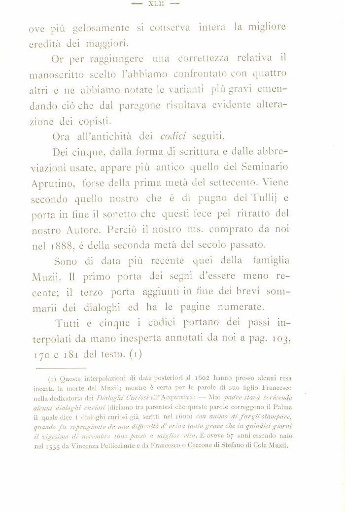 Dei cinque, dalla forma di scrittura e dalle abbreviazioni usate, appare più antico quello del Seminario Aprutino, forse della prima metà del settecento. Viene secondo quello nostro che è di pugno del Tulli) e porta in fine il sonetto che questi fece pel ritratto del nostro Autore. Perciò il nostro ms. comprato da noi nel 1888, è della seconda metà del secolo passato.