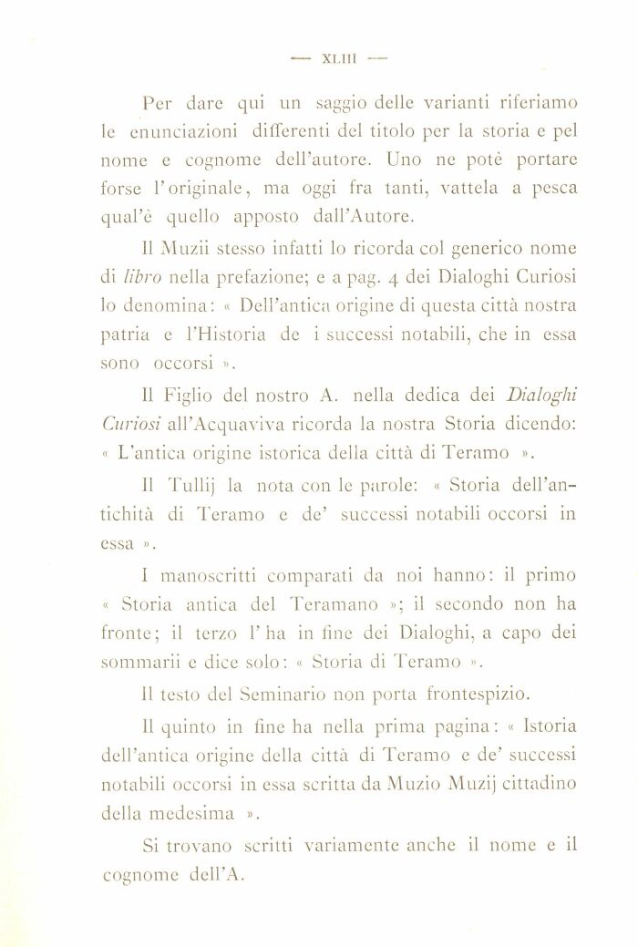 I manoscritti comparati da noi hanno: il primo « Storia antica del Teramano »; il secondo non ha fronte; il terzo l'ha infine dei Dialoghi, a capo dei sommarli e dice solo: « Storia di Teramo ».