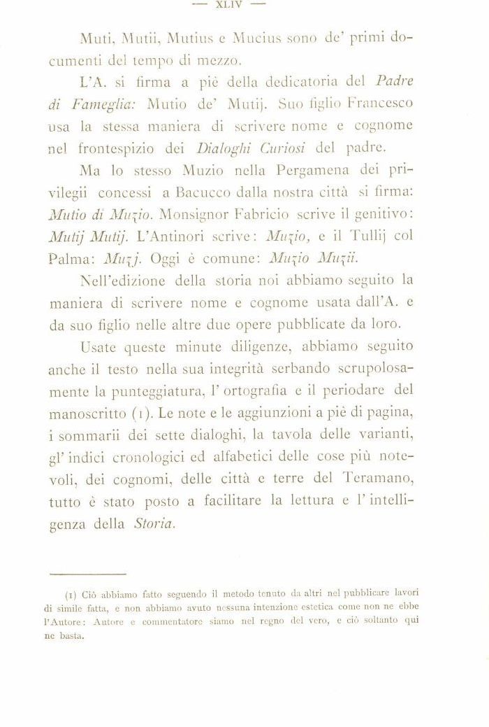 Usate queste minute diligenze, abbiamo seguito anche il testo nella sua integritą serbando scrupolosamente la punteggiatura, 1' ortografia e il periodare del manoscritto (i). Le note e le aggiunzioni a pič di pagina, i sommarii dei sette dialoghi, la tavola delle varianti, gģ' indici cronologici ed alfabetici delle cose pił notevoli, dei cognomi, delle cittą e terre del Teramano, tutto č stato posto a facilitare la lettura e l'intelligenza della Storia.